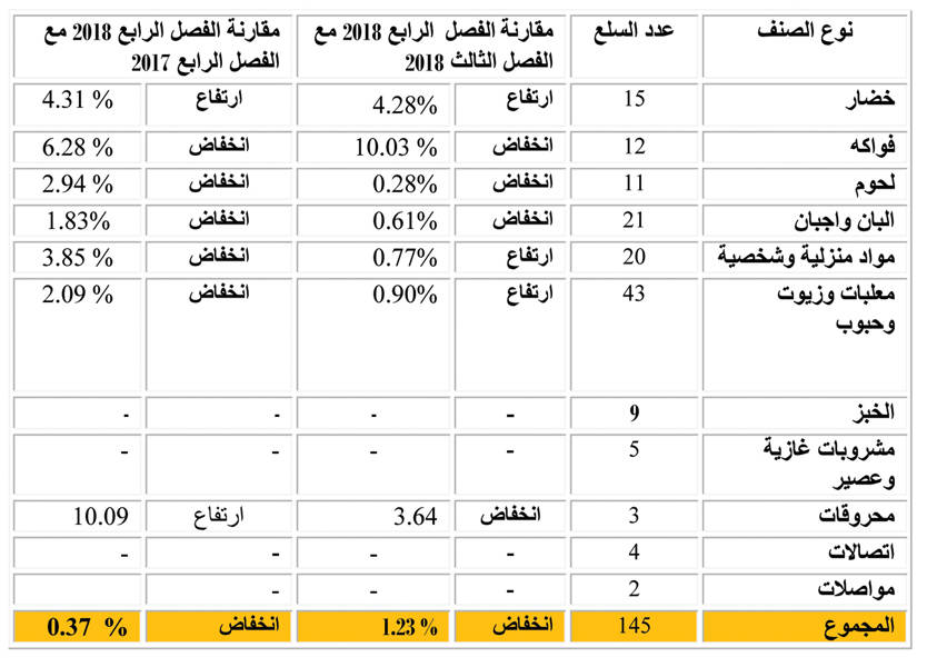 نشرت جمعية المستهلك نتائج تطوّر اسعار السلع والمواد الغذائية الفصل الرابع للعام 2018 وذلك بالنسبة للفصل الثالث 2018 والفصل الرابع 2017. يطال الجدول 145 سلعة وخدمة أساسية تشكل أساس استهلاك العائلات اللبنانية.