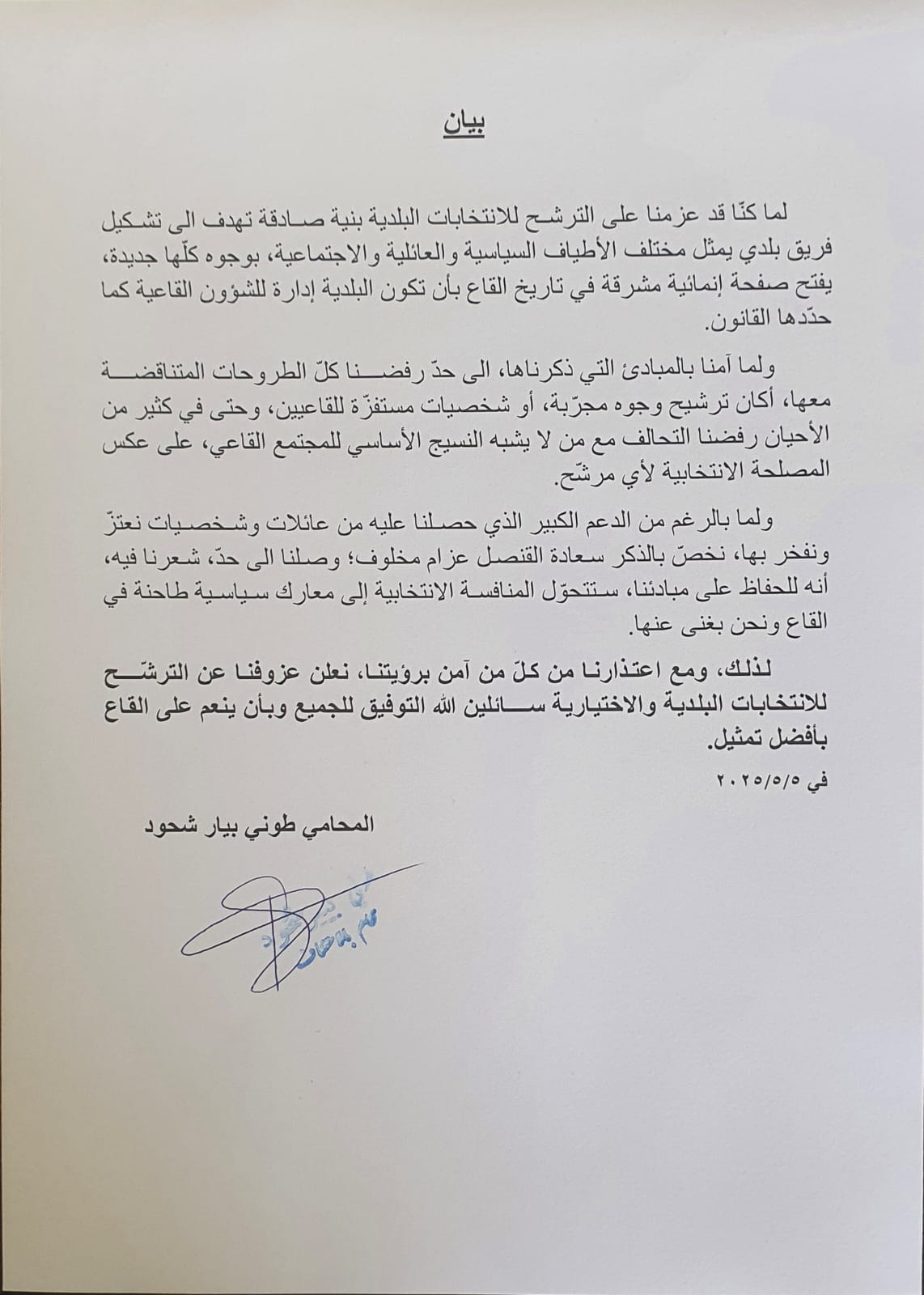 لذلك، ومع اعتذارنا من كلّ من آمن برؤيتنا، نعلن عزوفنا عن الترشّح للانتخابات البلدية والاختيارية، سائلين الله التوفيق للجميع وبأن ينعم على القاع بأفضل تمثيل.