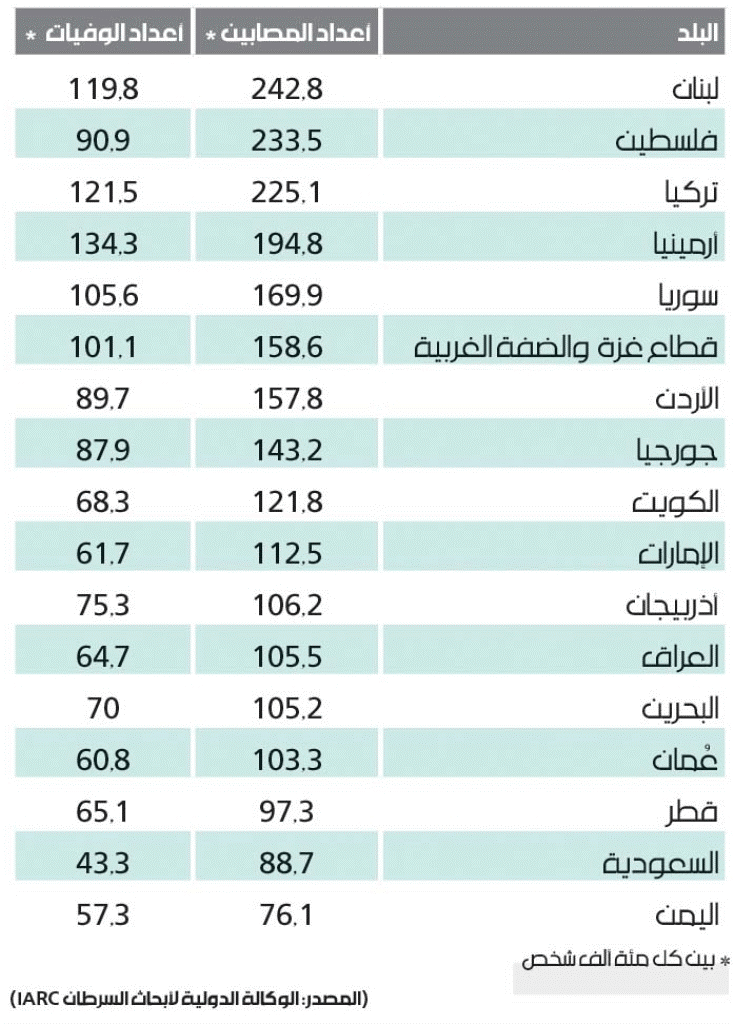 لفت تقرير صدر حديثاً عن منظمة الصحة العالمية الى أن هناك 242 مصاباً بالسرطان بين كل 100 ألف لبناني، فيما سُجلت أكثر من 17 ألف إصابة جديدة في 2018، ونحو تسعة آلاف وفاة بالمرض. هذه الأرقام تبدو نتيجة «طبيعية» للتلوث الذي يفتك بالبلد على كل المستويات منذ سنوات. وهي تجعل ضحايا السرطان في السنة أكثر من عدد الضحايا الذين سقطوا بين اندلاع الحرب الأهلية عام 1975 وعدوان تموز 2006، والذين يقدّرون بخمسة آلاف ضحية سنوياً.